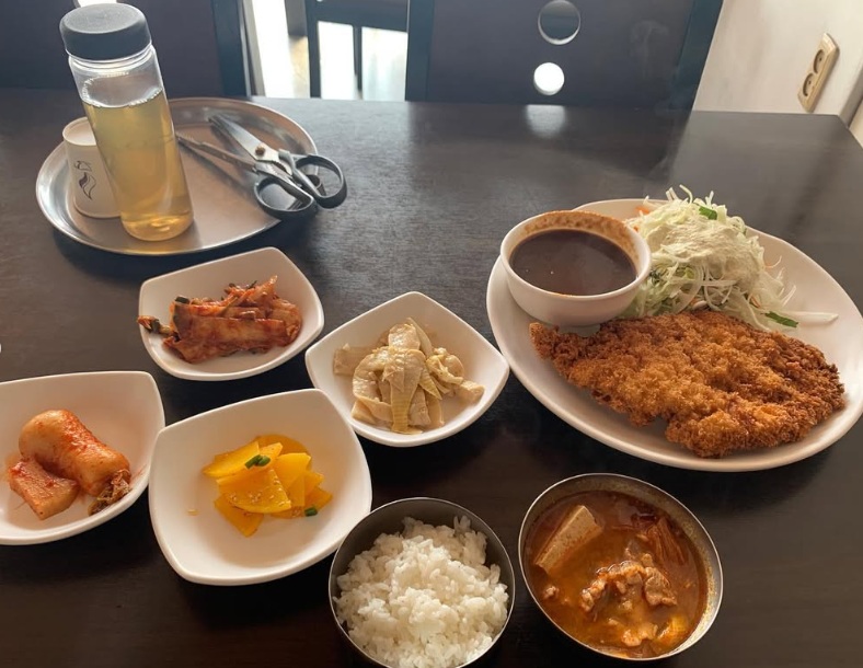 푸짐한 돈까스와 공기밥, 국(그때 그때 다르다), 반찬 4가지